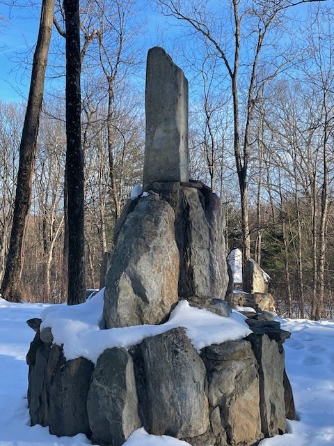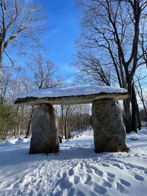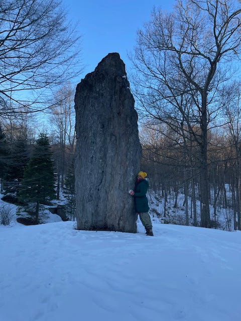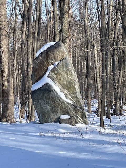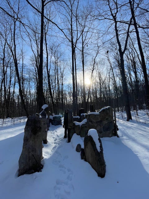 I step out of the car, ice cleats slipped over my boots, bundled in so many layers, I laughingly call myself the Stay Puft Marshmallow Man. Part of me can’t believe I’m here, in the single-digit cold, given my constant protests against the frigid brutality of this winter. But as my friend and I walk through the gate and into the park, where more than 90 ancient stones, in various configurations, have been set throughout the landscape, I feel a thrill of exhilaration.