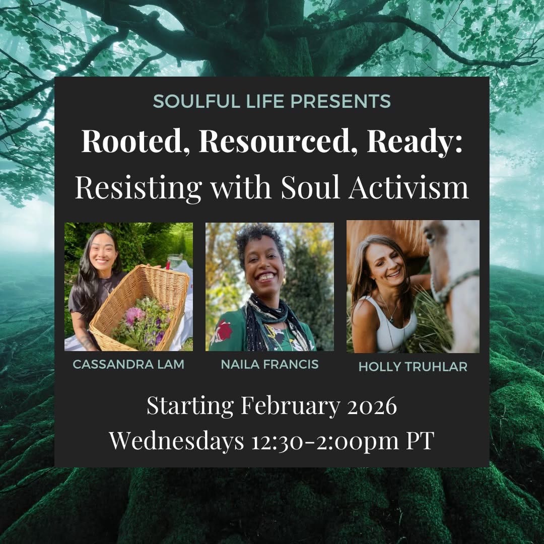Our newest series, Rooted, Resourced Ready: Resisting with Soul Activism, is especially dedicated to cultivating a soulful, political home where we can learn and grow together as a village of resistance, meeting these times from a place of relationality, embodiment, ritual, imagination and ancestral practices alongside political analysis and activism.