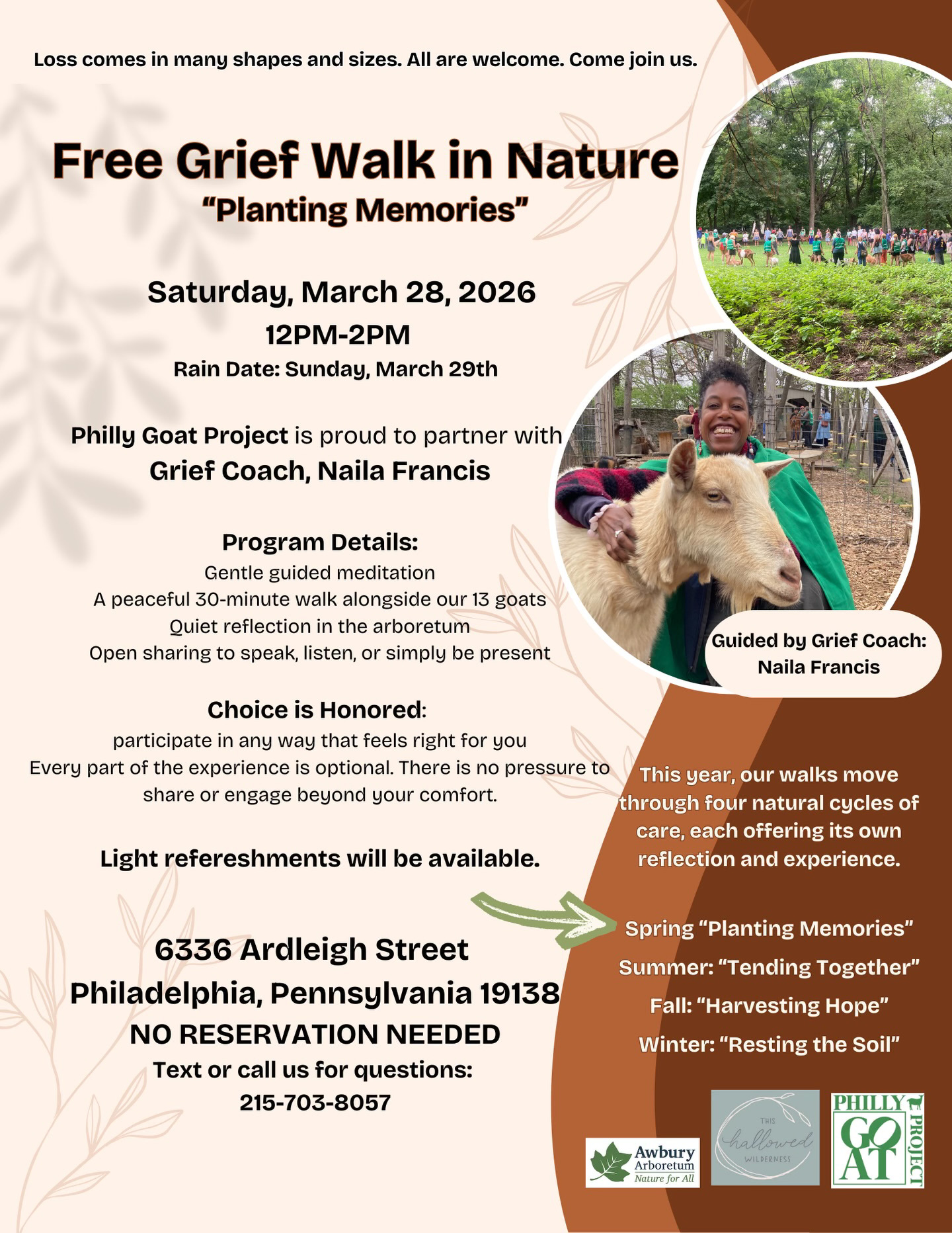 This remains one of my favorite community grief-tending spaces. You don’t have to be a lover of goats to join. They’re with us for part of the walk but the invitation is really a time to be with and move your grief in nature and community.